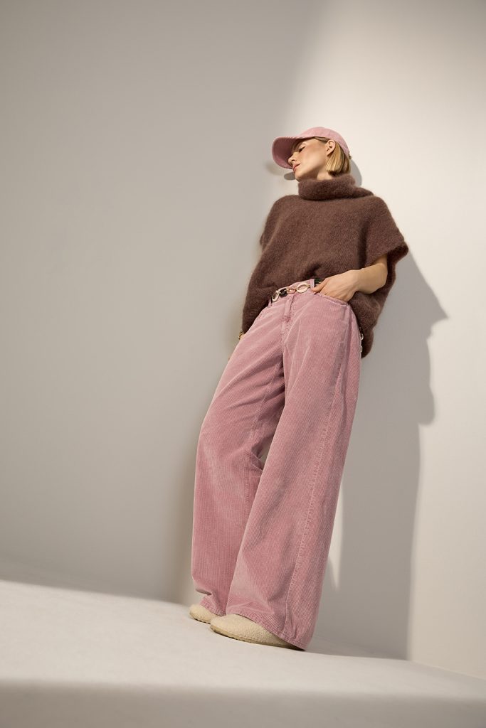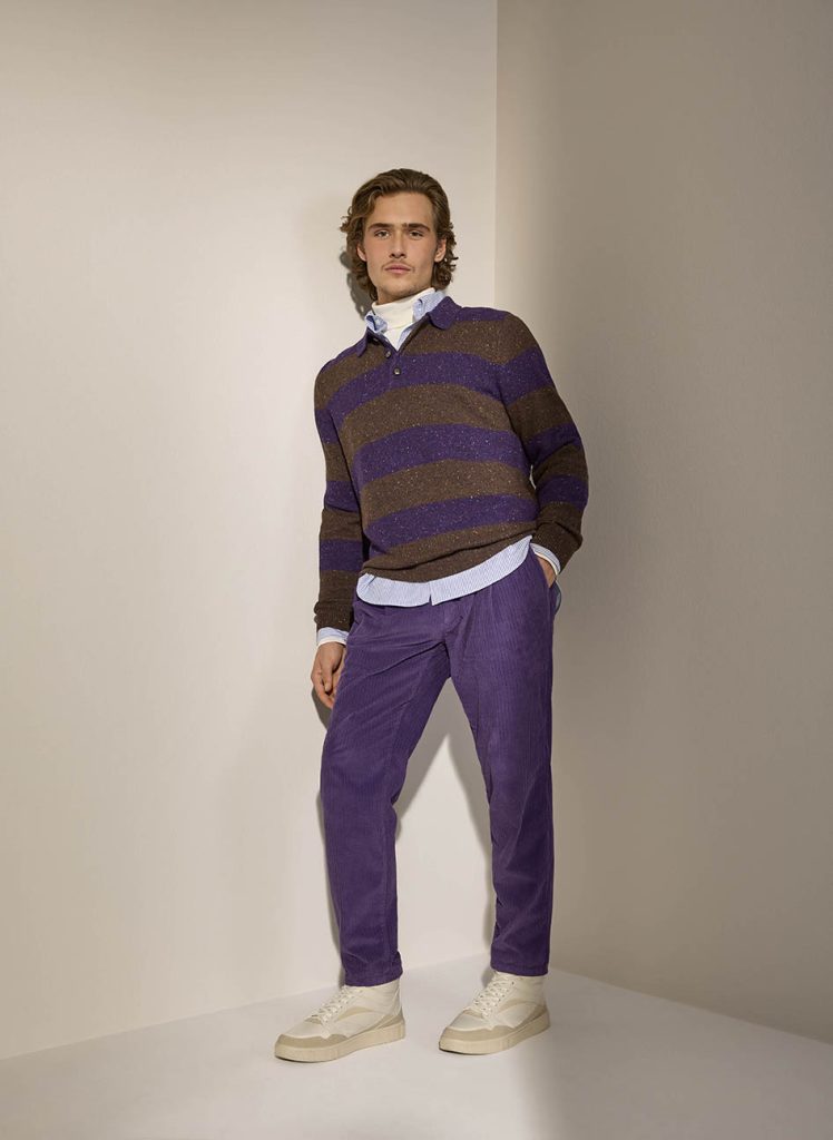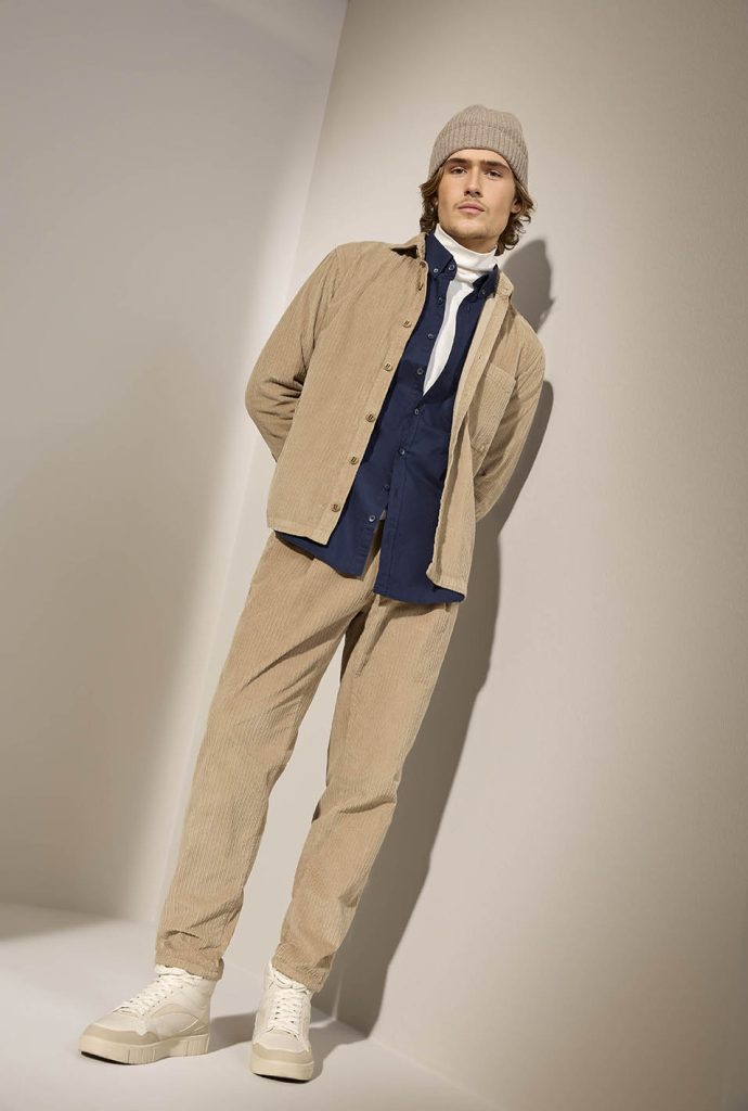 Auch die Menswear zelebriert Cord als Key-Material: von feinen bis breiten Rippen, von Workwear-inspirierten Sets bis zu modernen Preppy-Looks. Natürliche Materialien, markante Strickstrukturen und moderne Denim-Updates runden die Kollektion ab. Farblich dominieren Chocolate und Naturtöne, akzentuiert durch Plum und Silbergrau.