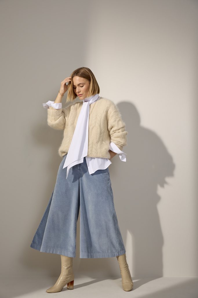 Die Womenswear verbindet einen modernen Bohème-Spirit mit smarten Layering-Looks. Zarte Volant-Chiffonblusen, Crochet-Elemente und Vintage-Denim treffen auf Cordsamt, luxuriöse Wintertexturen und edle Two-Tone-Optiken. Die Farbwelt reicht von warmen Neutrals über Grasgrün und Himbeere bis zu tiefem Plum und vielfältigen Blaunuancen.