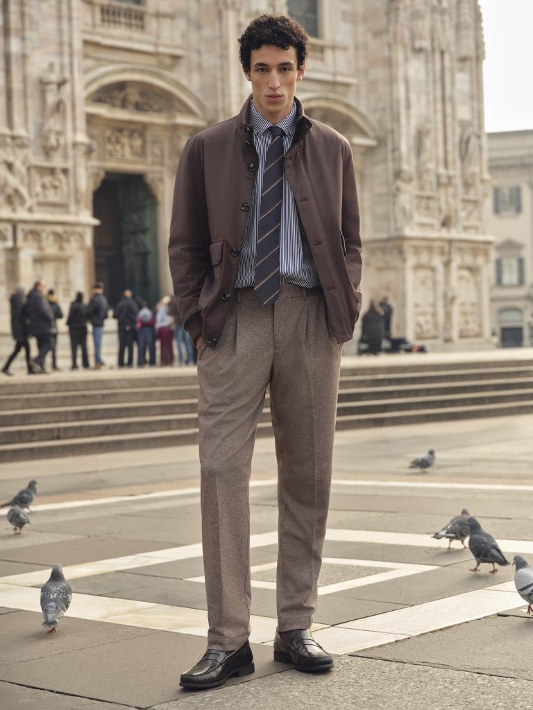 Hochwertige Wollmäntel, funktionale Jacken mit Performance-Oberstoffen und die technisch orientierte Blue Capsule spiegeln den modernen Anspruch wider. Winterliche Jersey- und Flanell-Sakkos, italienische Anzugqualitäten sowie Flanell- und Cordhemden betonen den Premiumanspruch. Die Stricklinie bietet Cotton-Cashmere, Lambswool bis hin zu luxuriösen Alpaka-Mix-Varianten, während die Hosenprogramme das Milano-Thema in eleganten Naturtönen, technischen Silhouetten oder edlen Woll- und Cashmere-Looks übersetzen.