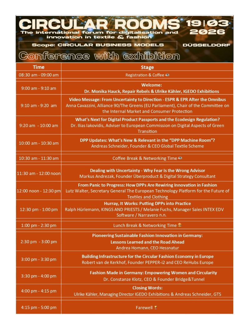Die CIRCULAR ROOMS gelten als europäischer Fachtreffpunkt für DPP, Datenmanagement und zirkuläre Geschäftsmodelle – unterstützt von CIRPASS 2 und der Global Textil Scheme Initiative.