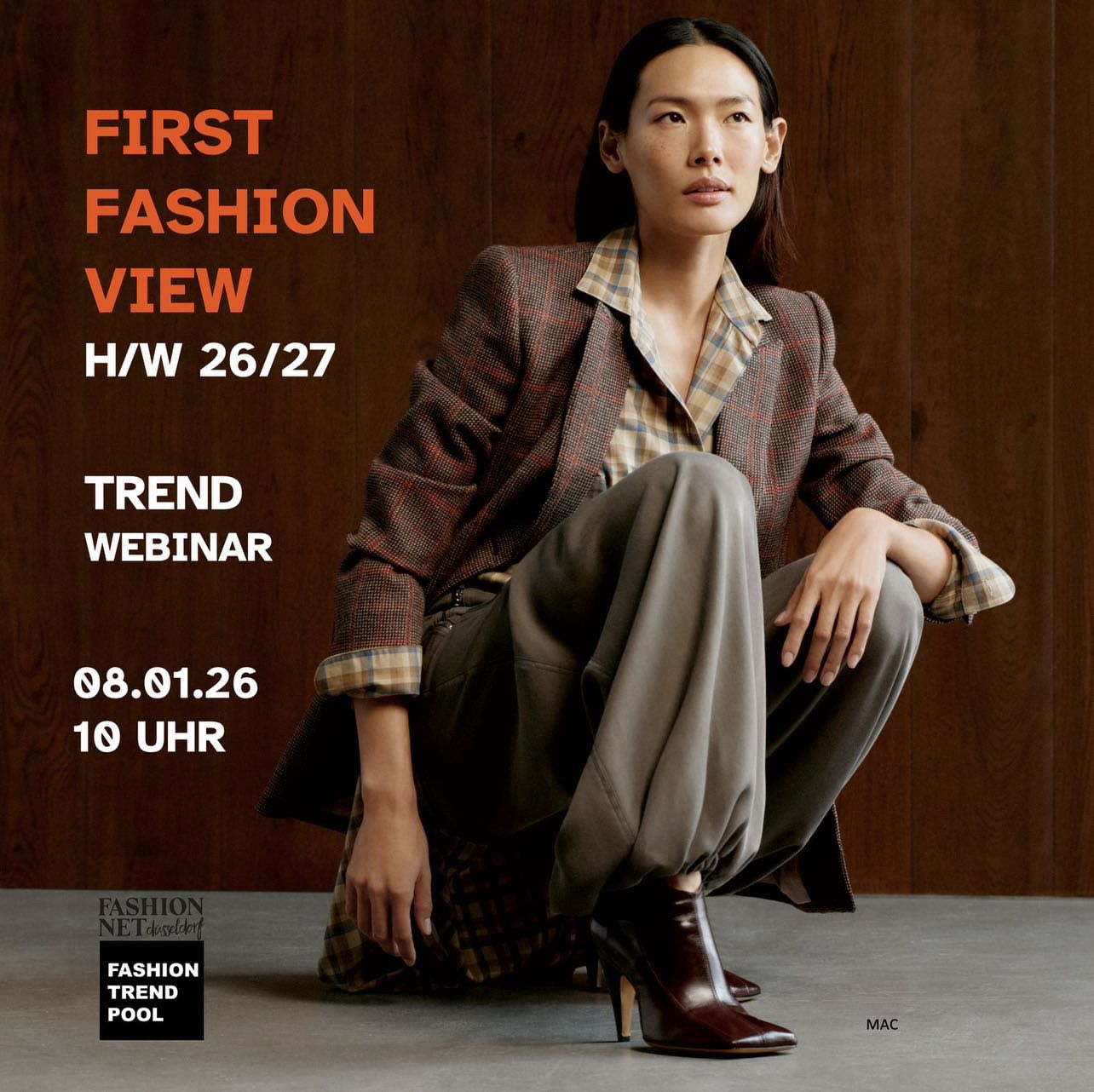 Am 8. Januar 2026 um 10 Uhr präsentieren Fashion Net Düsseldorf zusammen mit Fashion Trend Pool und Trendexpertin Karolina Landowski die relevanten Modethemen, Key-Looks und Top-Kollektionen für die Saison Herbst/Winter 2026/27 – kompakt und digital im kostenlosen Buyers Briefing Trendwebinar.